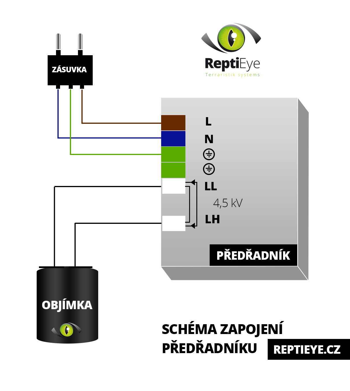 Zapojení: Lampu ReptiEye zašroubujte do klasické porcelánové (keramické) objímky E27, nebo svítidla, které se připojí do předřadníku 70w. Při prvním "nastartování" (rozsvícení) lampy je nutné, nechat jí nepřetržitě běžet alespoň 2 hodiny, aby se zaběhla, jinak hrozí její poškození!